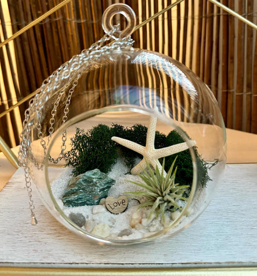 This hanging glass terrarium is an elegant decorative piece featuring a transparent glass globe with a small opening, designed to display a combination of natures finest natural and decorative elements, over a bed of sand and preserved Moss.